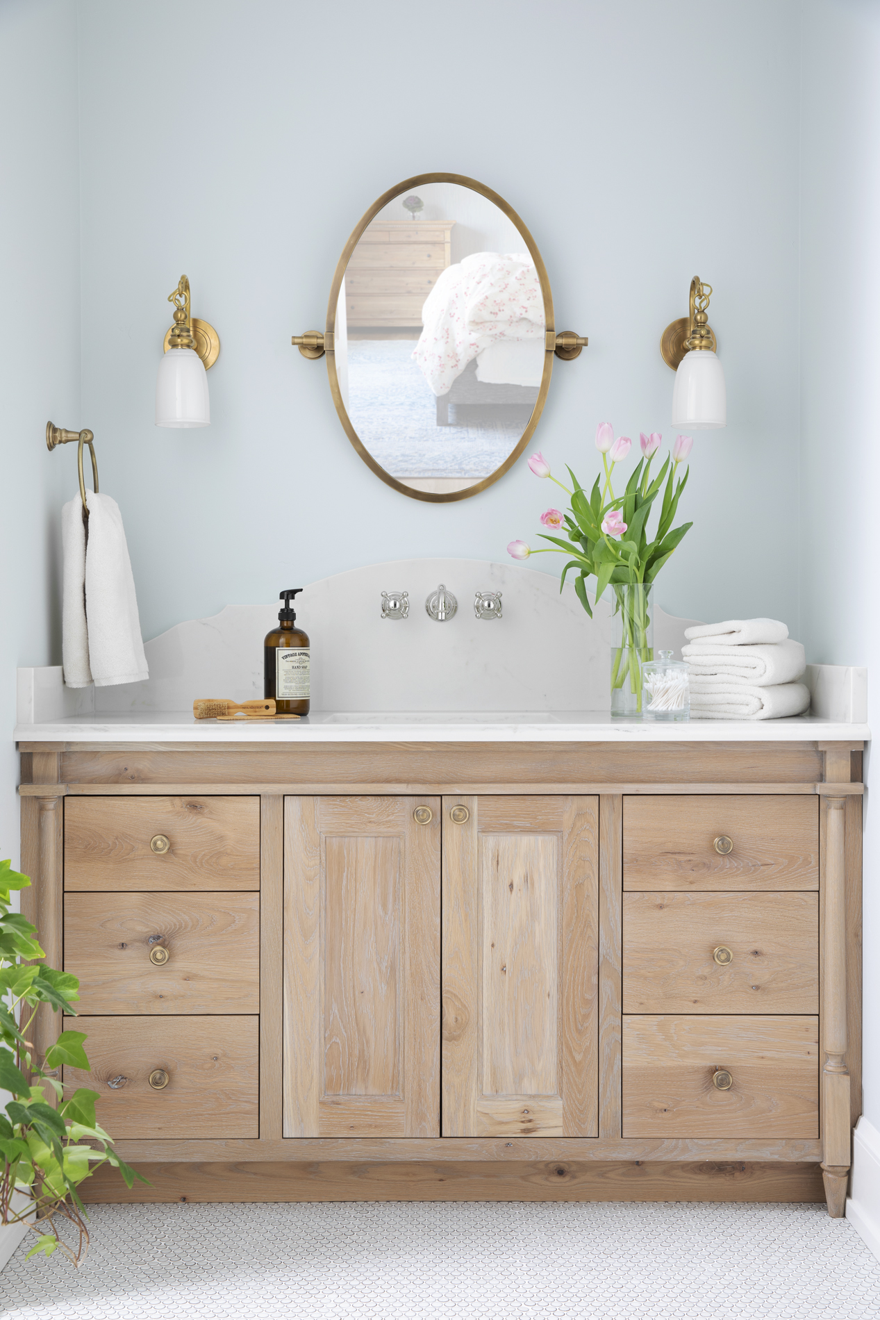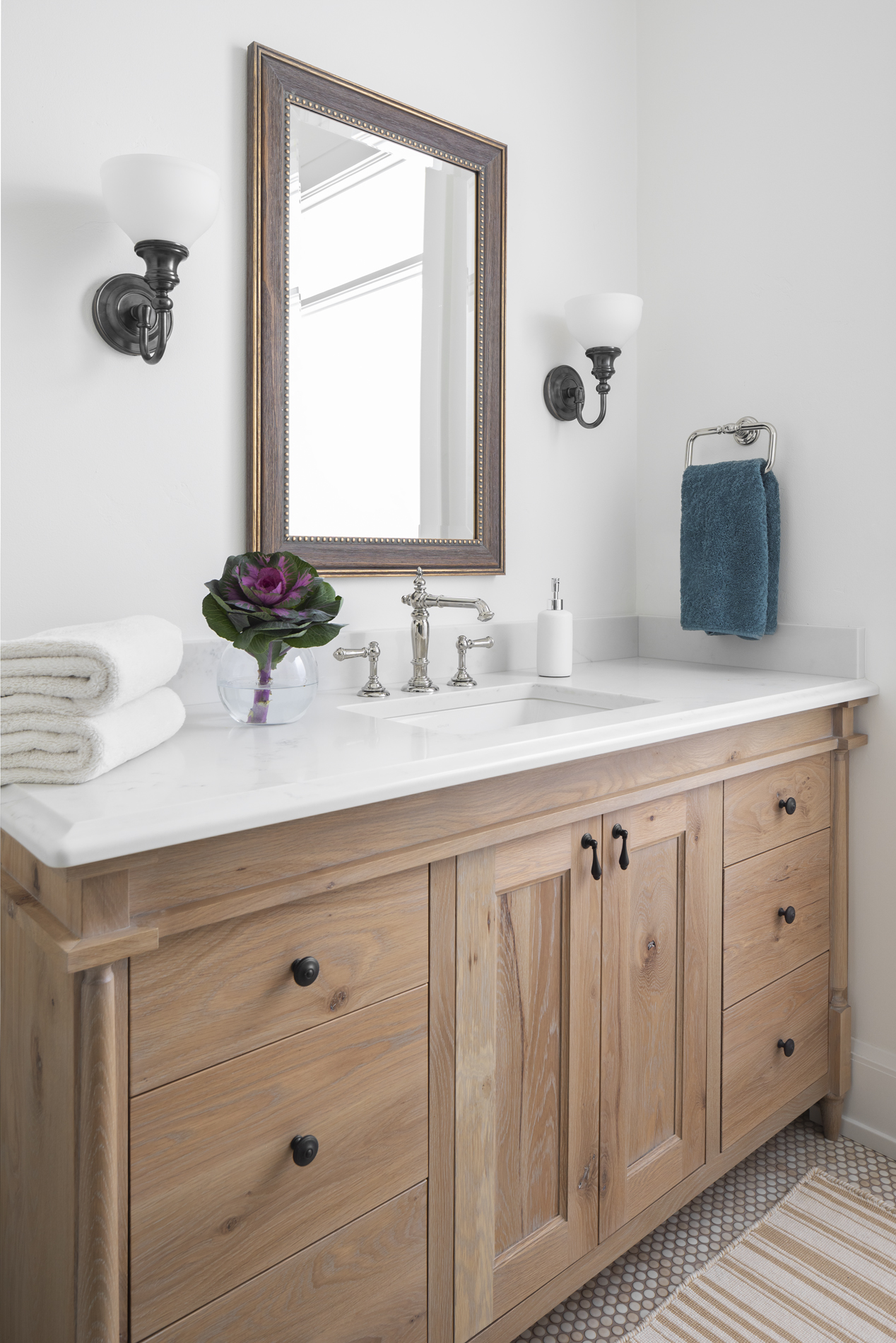 Dual white oak craftsman style vanities with quartz countertops provide generous storage and counter space, while a private water closet enhances functionality and flow.